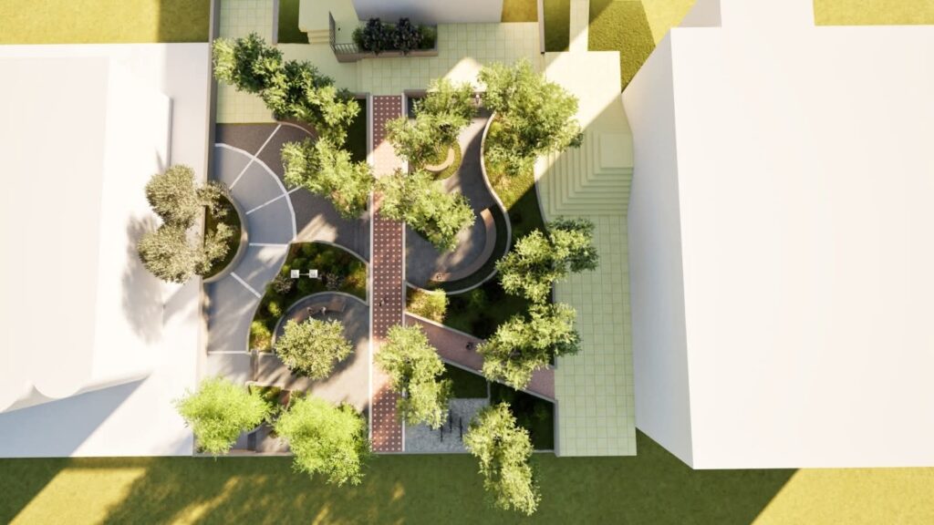 Πιο συγκεκριμένα η παρούσα πρόταση διαφοροποιεί τμηματικά την λειτουργική οργάνωση του Κοινόχρηστου Χώρου του Ιατρείου, προσθέτοντας χώρους με νέες δραστηριότητες, εγκαθιστά νέο εξοπλισμό (καθιστικά, κάδους, βρύση, ποδηλατοστάτες, δενδροδόχους), για την καλύτερη λειτουργία της. Ο σχεδιασμός περιλαμβάνει εκσκαφές, δάπεδα από νέα υλικά, επανασχεδιασμό των διαδρόμων και βελτίωση των υποδομών.
