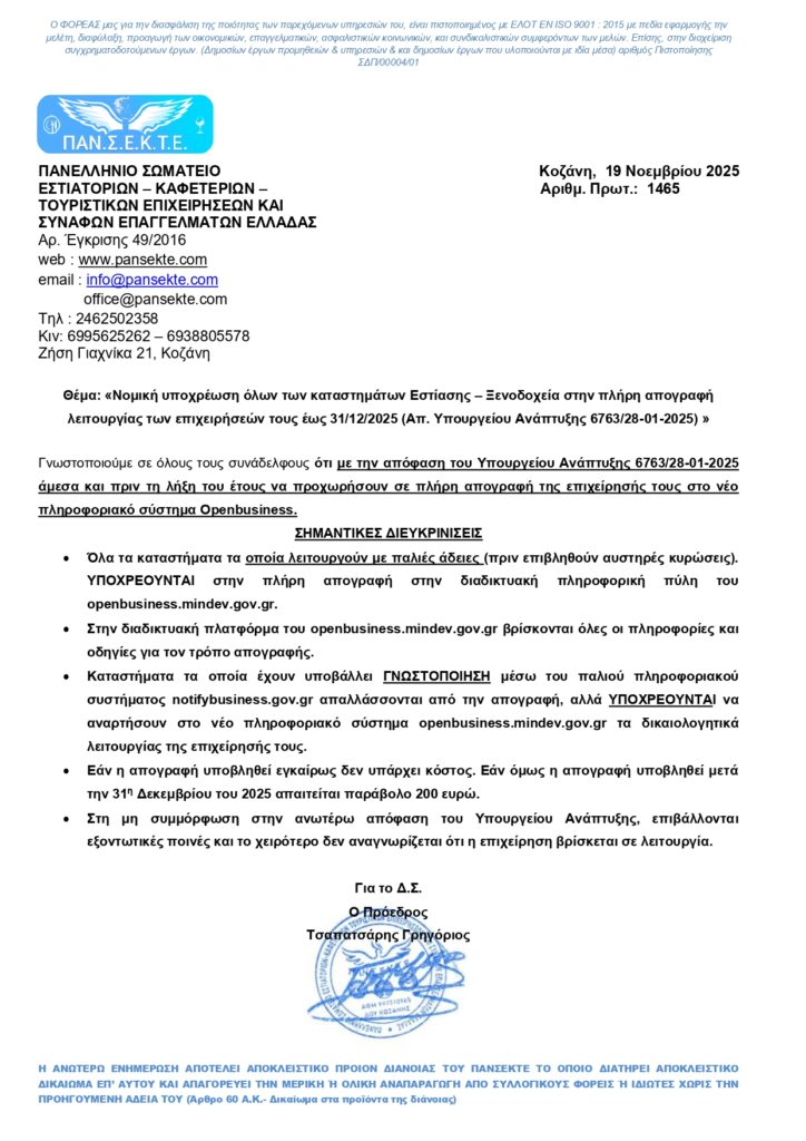 Νομική υποχρέωση όλων των καταστημάτων Εστίασης – Ξενοδοχεία στην πλήρη απογραφή λειτουργίας των επιχειρήσεών τους έως 31/12/2025